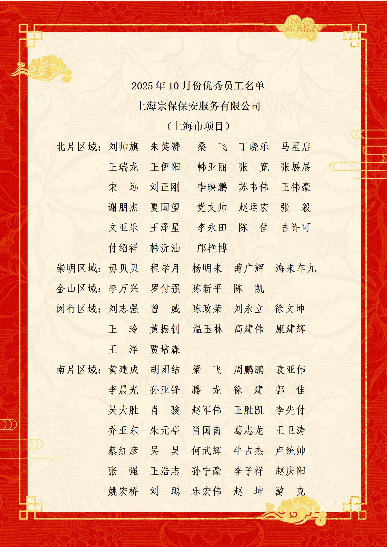 10月份,公司廣大員工根據(jù)甲方的任務要求,按照公司的部署安排,認真踐行公司“規(guī)范經(jīng)營 誠信為本 服務至上”的發(fā)展理念,助力完成了多項大型活動安保任務,全力配合甲方做好了城市管理輔助、治安巡邏聯(lián)防、物業(yè)服務保障、生態(tài)環(huán)境保護、高鐵線路巡防等工作。期間,涌現(xiàn)出了一批盡心履責、崗位建功、拾金不昧、熱心助人的優(yōu)秀員工和先進典型。